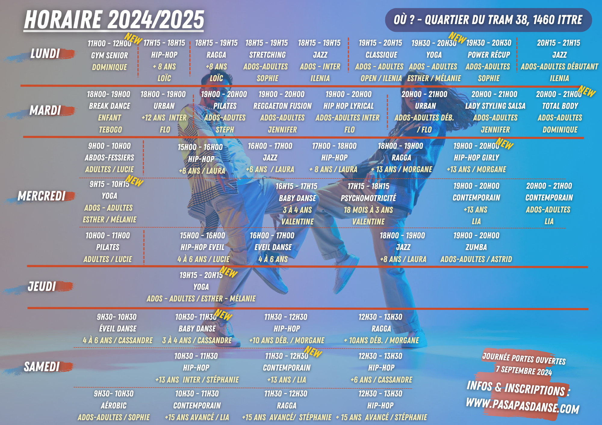 Découvrez notre horaire de cours de danse et de sports ci-dessous !